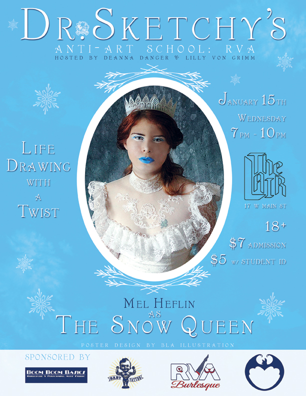 A chill is in the air, but Dr.Sketchy's RVA will have your sketchbooks burning with desire! January's model, Mel Heflin will melt your heart as ...the Snow Queen!