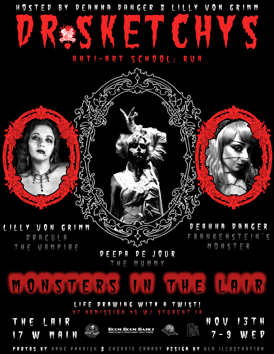 Like the leaves, many changes are happening at Dr.Sketchy’s RVA! We let the starting hour fall back and now have a new home at THE LAIR! And what a better way to celebrate this new move than to release some monsters?