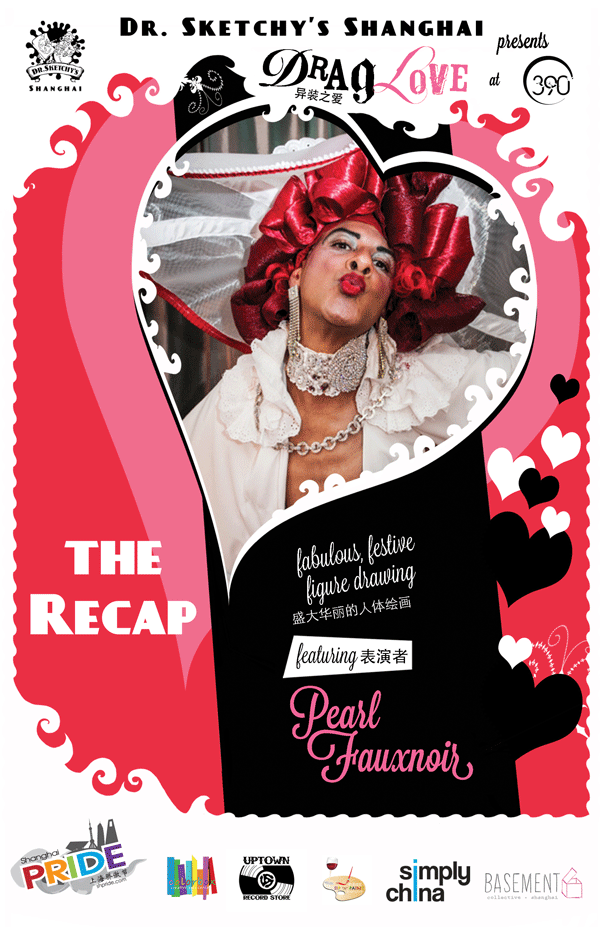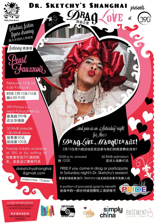 On February 15th and 16th, we here at Dr. Sketchy's Shanghai, along with our sensational subject Pearl Fauxnoir, provided the cure for your Valentine's Day hangover with DragLove at our new permanent home, 390!