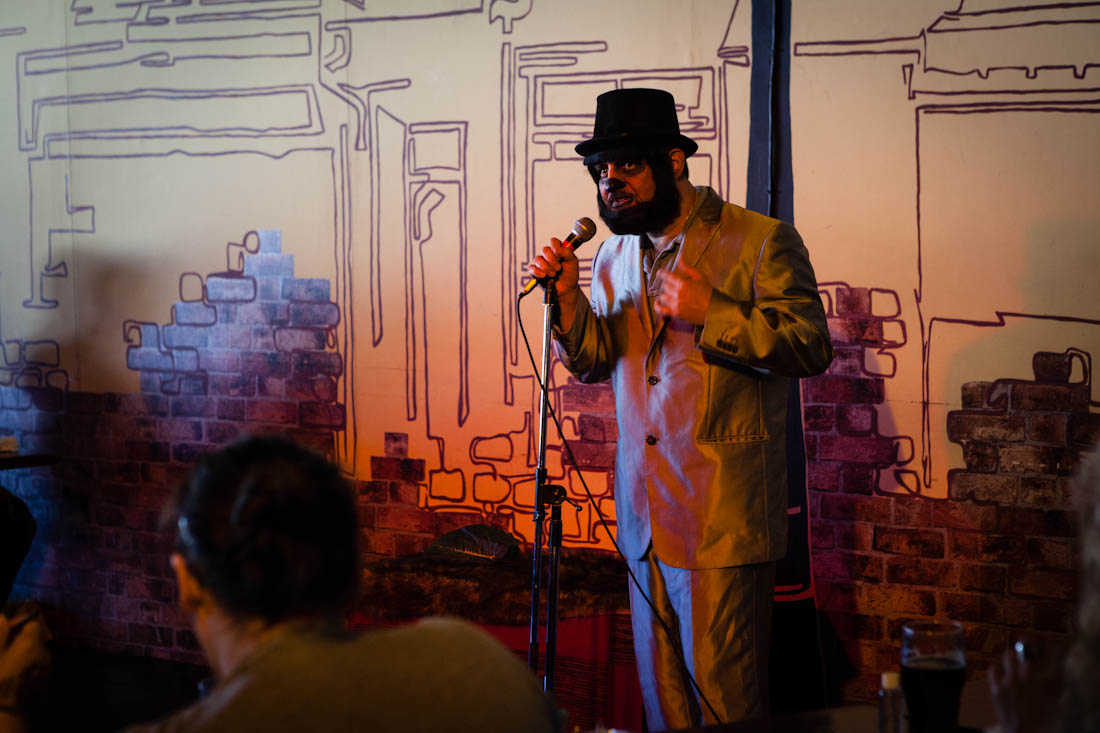 Toronto burlesque scene veteran Canadian Wolfman was the evening's Monster of Ceremonies. Wolfman kept the session rolling with his one-liners, groaners, and encyclopedic collection of puns.