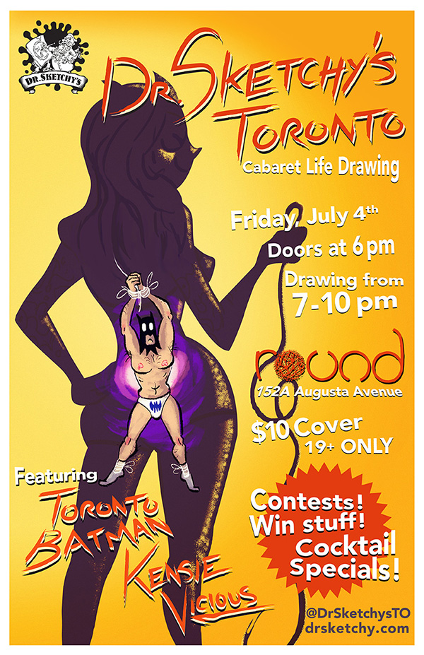 Two Toronto trouble makers go out of the comic pages and into the dungeon at the upcoming Dr.Sketchy's Toronto session. Naughty tattooed hottie Kensie Vicioüs and beefcake batboy Toronto Batman will be posing together in their skimpiest costumes.
