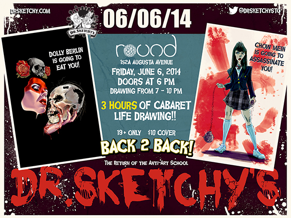 It's a grindhouse double feature with Dolly Berlin as a ravenous cannibal and Chow Mein as the deadly Tarantino schoolgirl Gogo Yubari. Enjoy three hours of costumed (and not so costumed) life drawing as two glamorous burlesque performers bring out their inner bad girls.