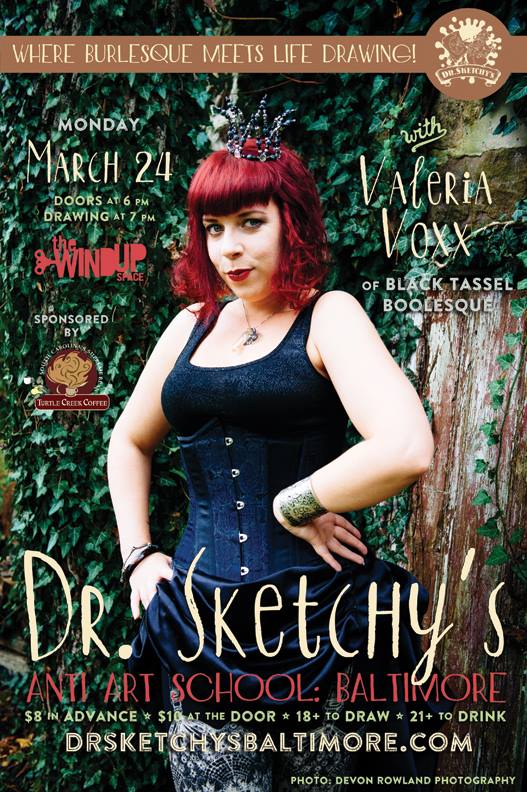 Next Dr. Sketchy's Baltimore is Monday, March 24th with Valeria Voxx of Black Tassel Boolesque at the Windup Space!