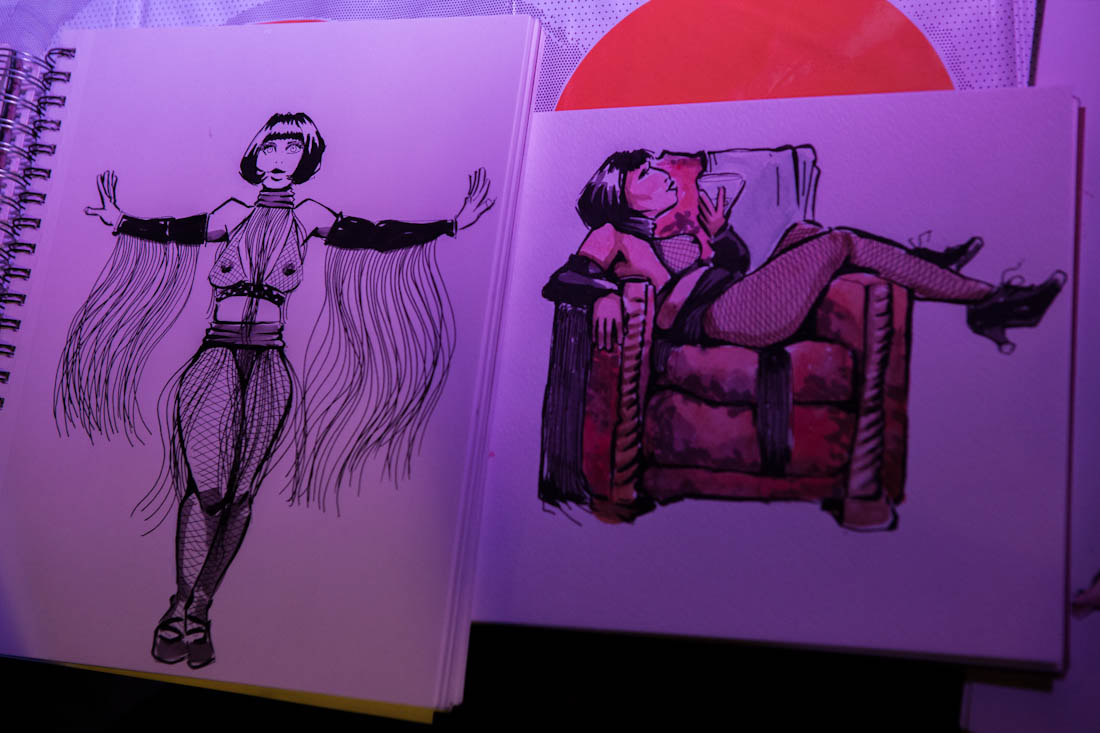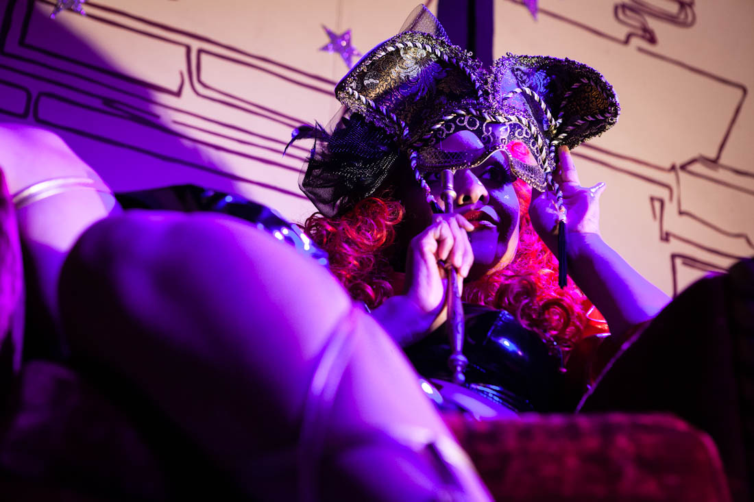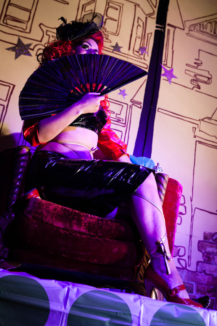 Obskyura entered the room in big, red hair and a shiny, skintight outfit to match. She has no problem drawing eyes on her.