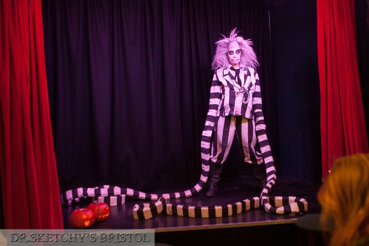 Next up with welcomed our chaos creating, lovable 80’s character ‘Beetlejuice’ - throwing poses, bugs and burps all over the room. Under all that hair and extreme make-up we had the very talented Welsh lovely Sandy Sure who later performed at the Bristol Burlesque Festival with her Lizard routine, we hope taking off all that make up wasn’t to much trouble?