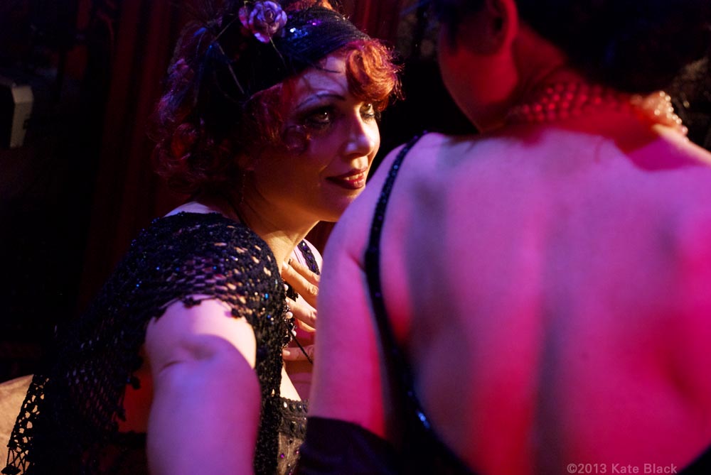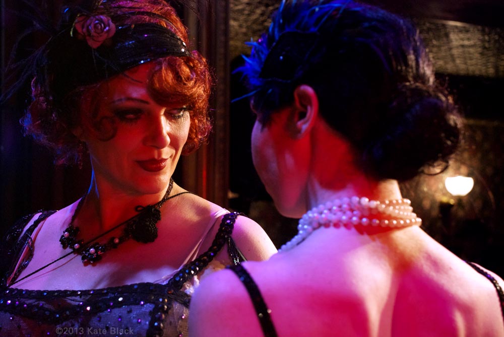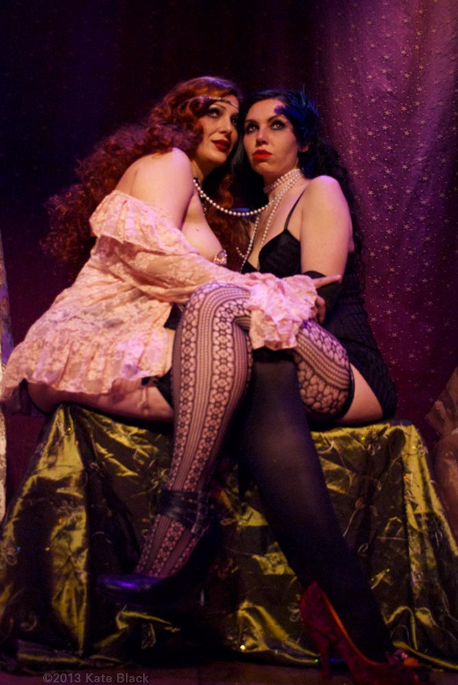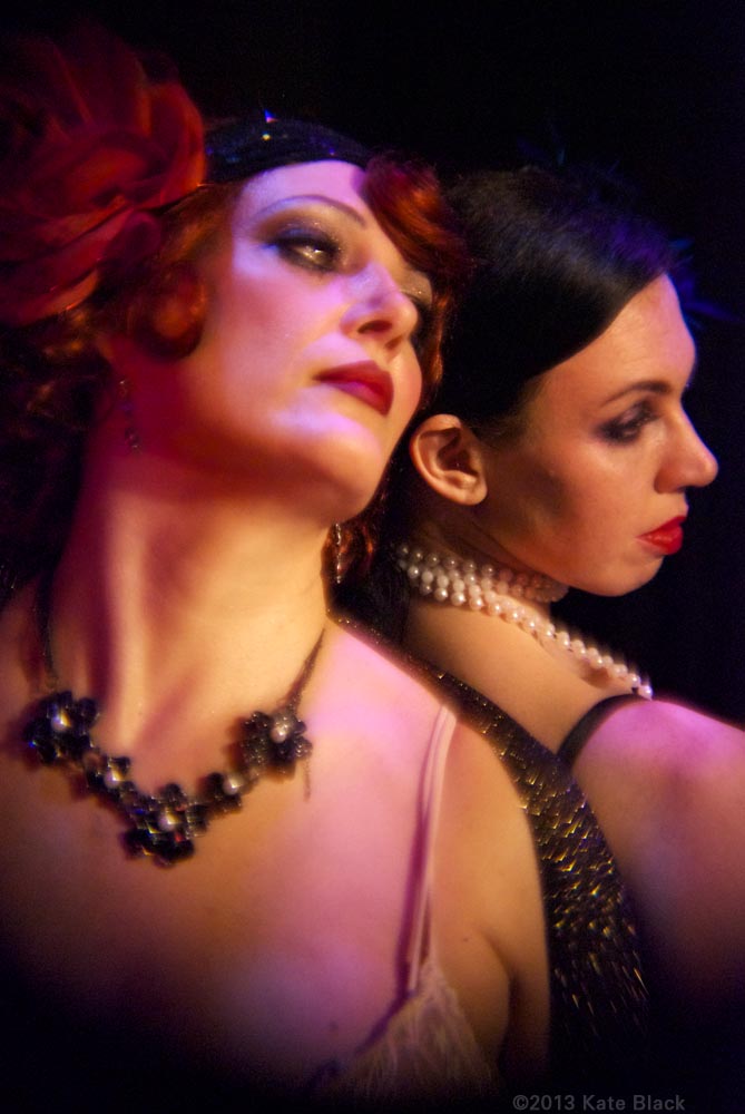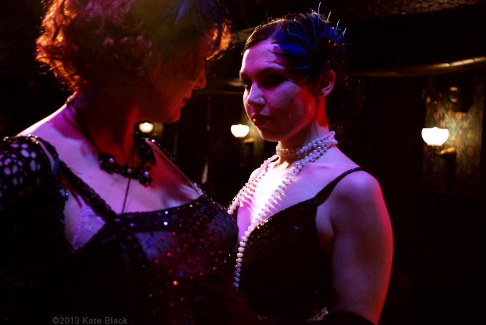 There's been a horrible murder...The lens of time has been scratched and battered, so we can only see parts of the whole picture, but what we can see is two women having a clandestine rendezvous. I will let you in on their identities, and the details will unfold by and by. The dark beauty is Katelan Foisey who plays the part of Lucrezia, a Barber's wife who lives next door to the Speakeasy, ...and the red haired dame is me...Kat Mon Dieu, in the role of "Hope Dare" a showgirl at the Speakeasy owned by my boss, Frank. Lucrezia and my boss were having an affair and unfortunately her husband caught wind of it and is accused of murdering Frank.