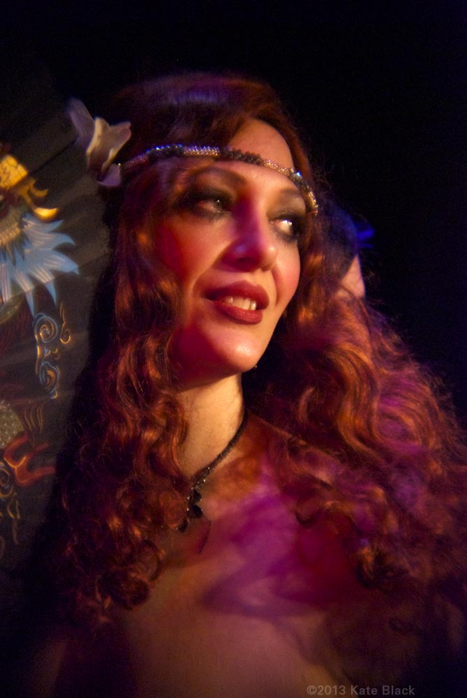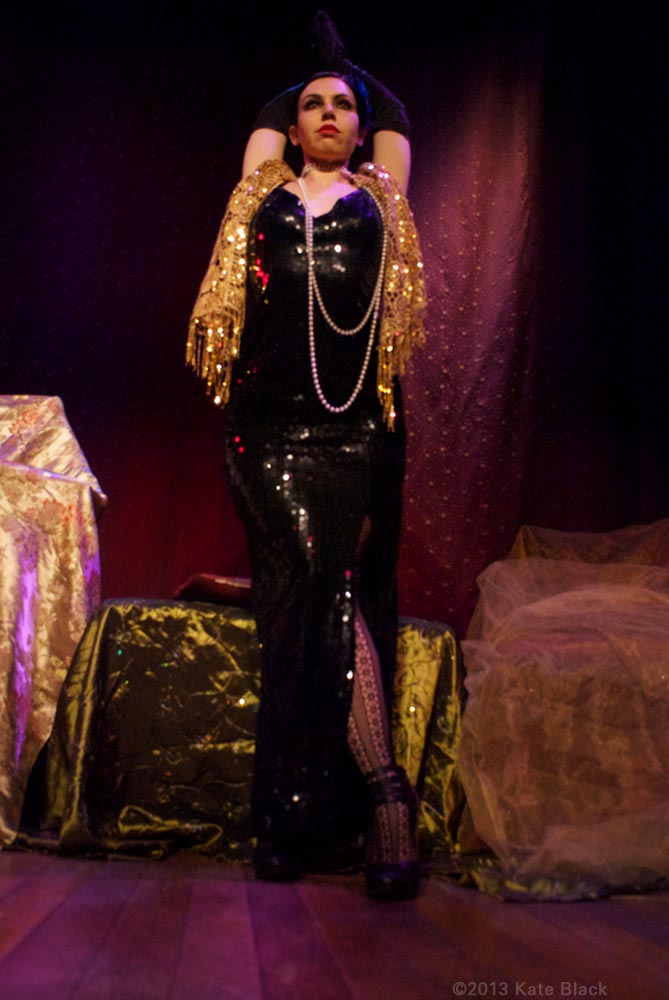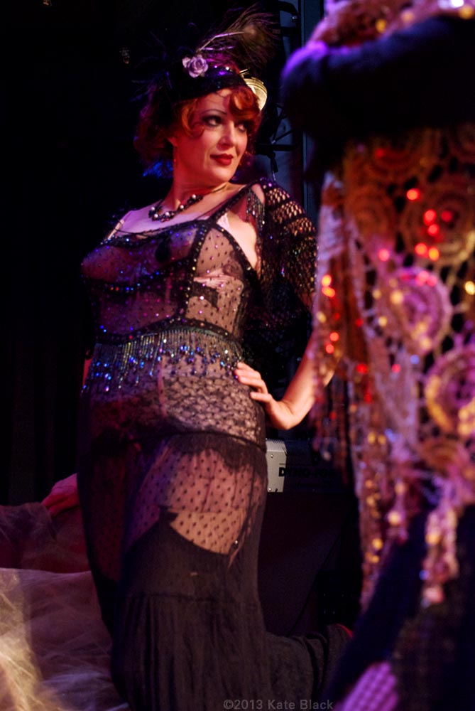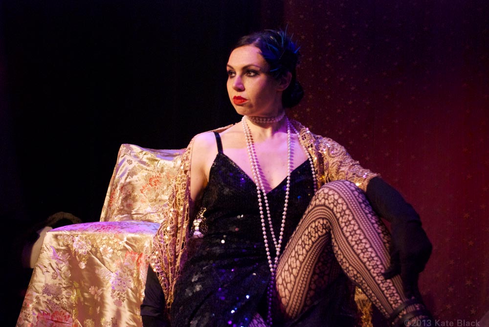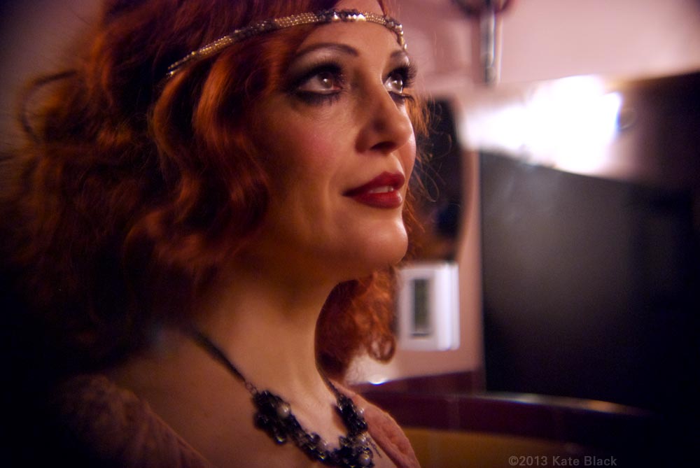 There's been a horrible murder...The lens of time has been scratched and battered, so we can only see parts of the whole picture, but what we can see is two women having a clandestine rendezvous. I will let you in on their identities, and the details will unfold by and by. The dark beauty is Katelan Foisey who plays the part of Lucrezia, a Barber's wife who lives next door to the Speakeasy, ...and the red haired dame is me...Kat Mon Dieu, in the role of "Hope Dare" a showgirl at the Speakeasy owned by my boss, Frank. Lucrezia and my boss were having an affair and unfortunately her husband caught wind of it and is accused of murdering Frank.