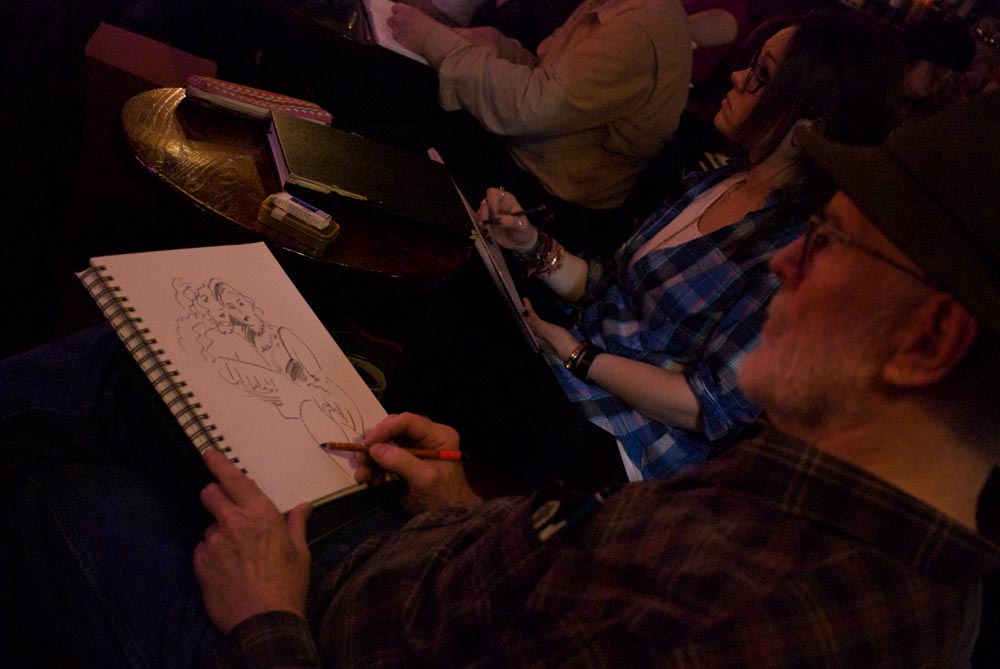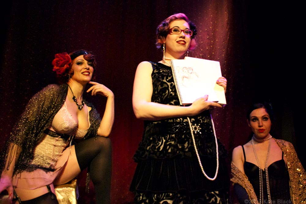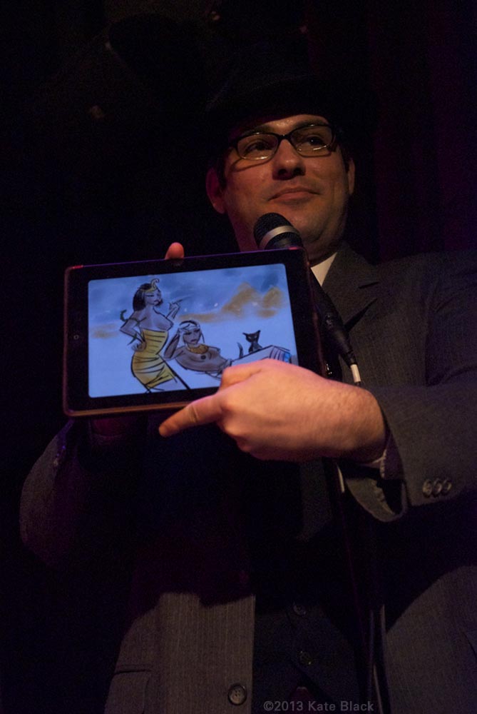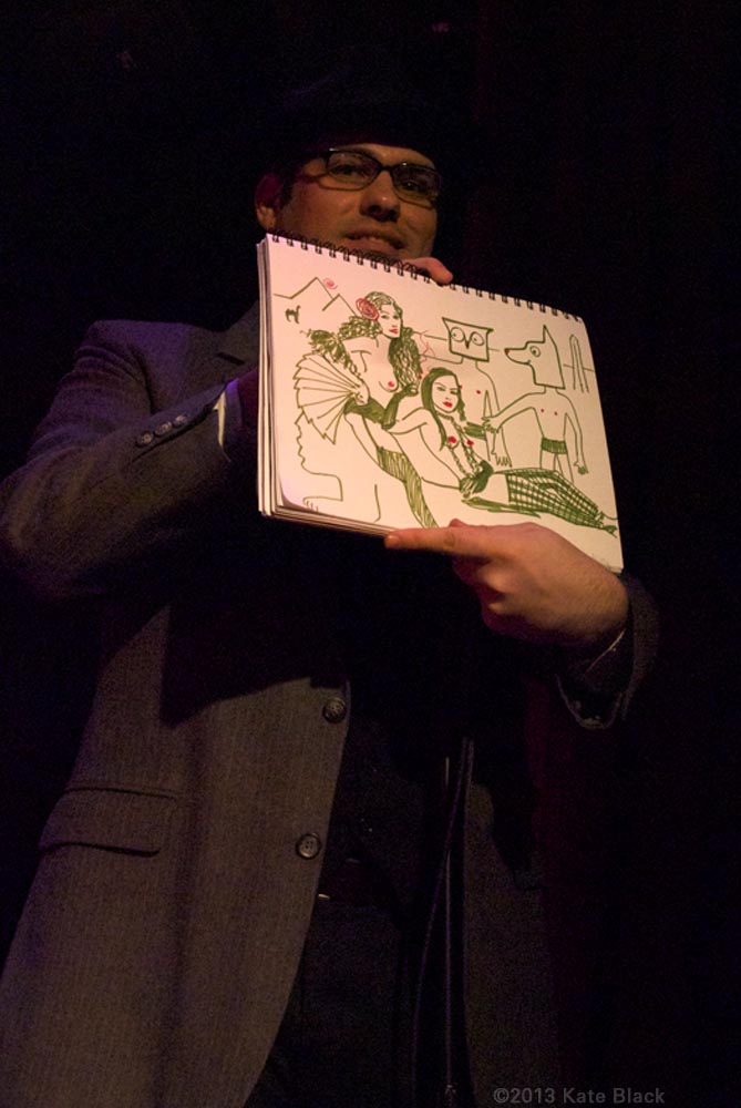 Back to our sponsor for the Drinking Game...where we pull skulking artists out of their seats to down some rotgut and win a prize! I think the challenge was to help us escape by placing us at any other time in history...these were the top two as chosen by audience applause.