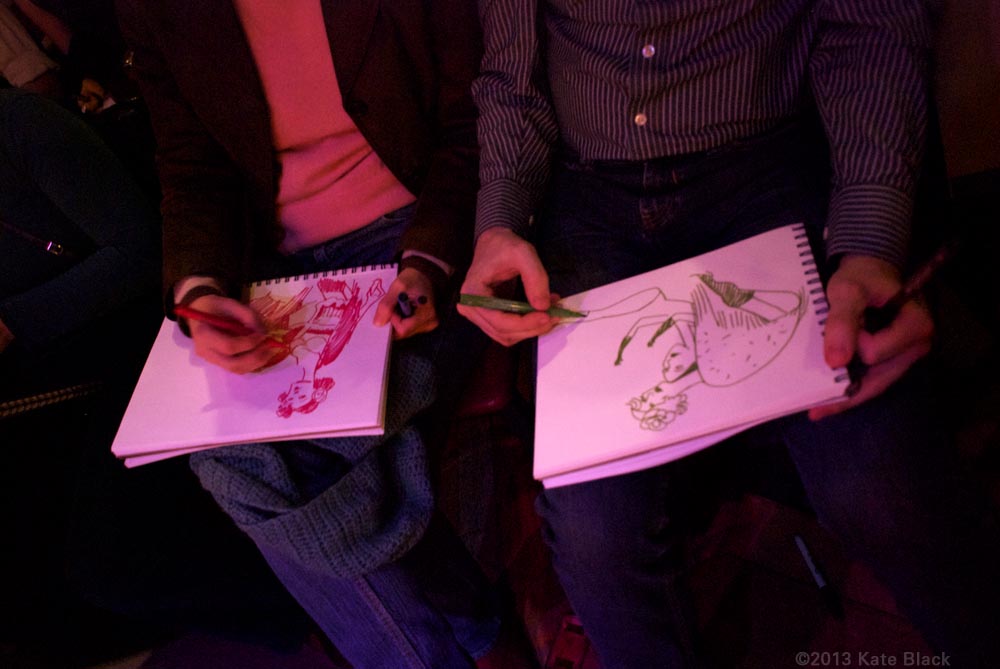 Lucrezia and I have become aware of the shadowy Art Monkeys, stealing illicit sketches of our increasingly revealed forms...the more articles of clothing we remove, the more furiously move the artists implements, tracing our forms as we become uninhibited and familiar.